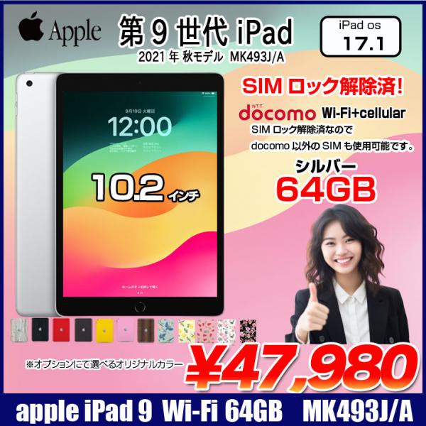 【中古iPad SIMロック解除済】Apple iPad9 第9世代 MK493J/A Docomo Wi-Fi+cel 2021 64GB A2604 [A13 Bionic 64GB(SSD) Retina 10.2 iPadOS 17 シルバー ☆ ] :アウトレット