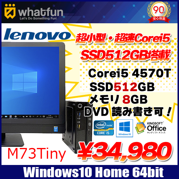 【中古パソコン】 Lenovo M73 Tiny 中古デスクトップパソコン Win10 極小サイズ 第四世代 [Corei5 4570T 2.9GHz メモリ8G SSD512GB マルチ USB3.0 ]