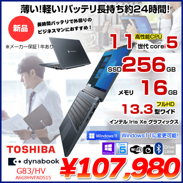 【新品パソコン】東芝 DynaBook G83/HV A6G9HVFAD515 Win10Pro Windows11対応 第11世代 フルHD [Core i5 1135G7 メモリ16GB SSD256GB カメラ 13.3型]:新品