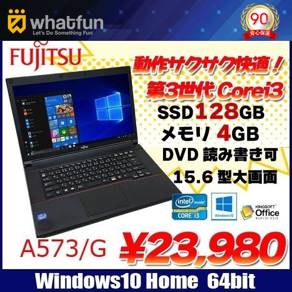 【中古パソコン】富士通 A573/G 中古 ノートパソコン Office Win10 第3世代 [corei3 3120M 2.5GHz 4G SSD128GB マルチ 無線 15.6型 ] :良品