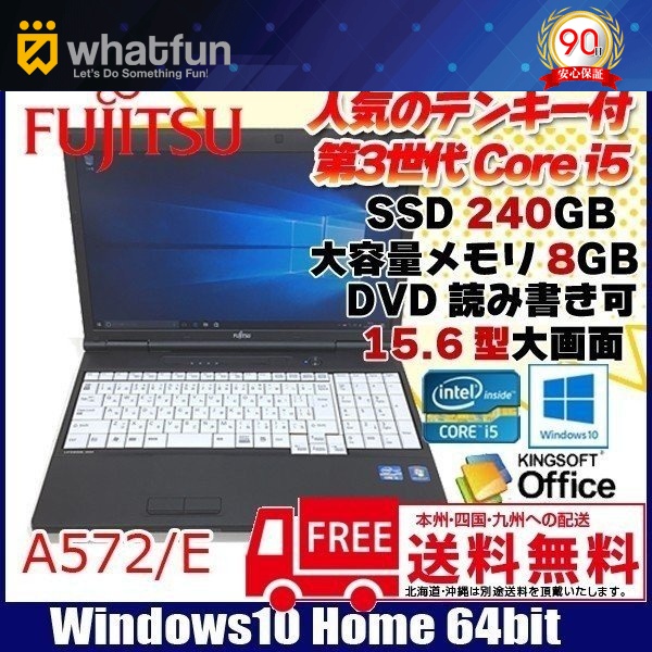 【中古パソコン】富士通 A572/E 中古 ノートパソコン Office Win10 大画面 テンキー [core i5 3320M 2.6GHz 8G SSD240GB マルチ 15.6型 A4 USB3.0 無線]:アウトレット