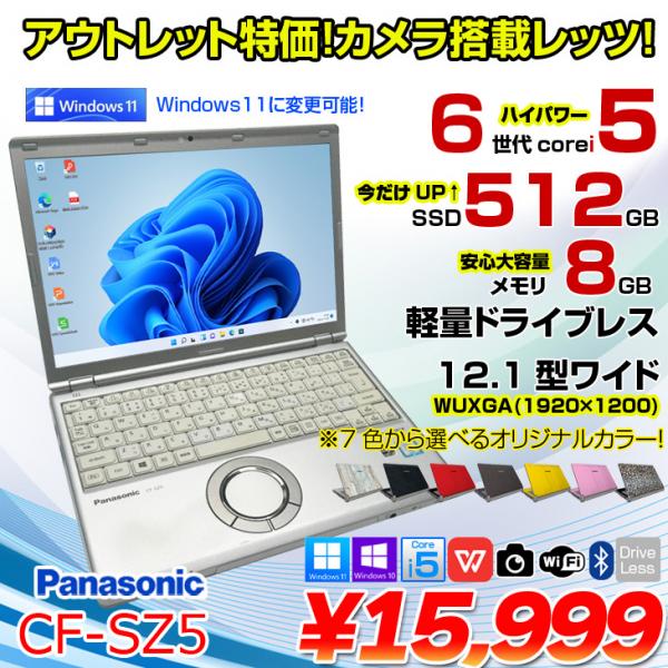 【中古パソコン 今だけSSD倍増↑】Panasonic CF-SZ5 中古 レッツノート 選べるカラー Office Win10 or Win11 [Core i5 6300U 8GB 512GB 無線 カメラ 12.1型] :アウトレット