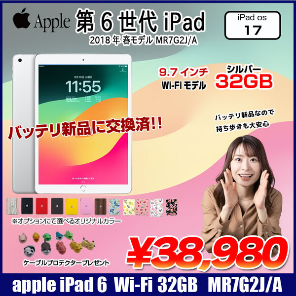【新品バッテリに交換済】Apple iPad 第6世代 MR7G2J/A Wi-Fi 2018 32GB A1893 [ A10 32GB(SSD) 9.7インチ iPadOS 17 シルバー] :良品