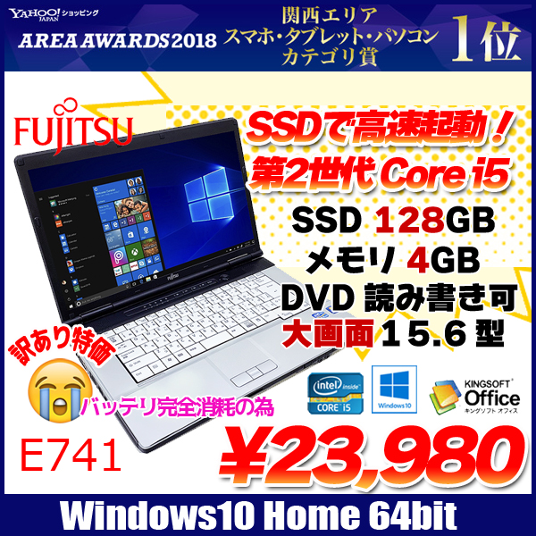 【中古パソコン】富士通 E741 中古 ノートパソコン Office Win10 SSD塔載 [corei5 2520M 2.5GHz メモリ4G SSD128GB マルチ 15.6型 A4 ] :アウトレット訳あり