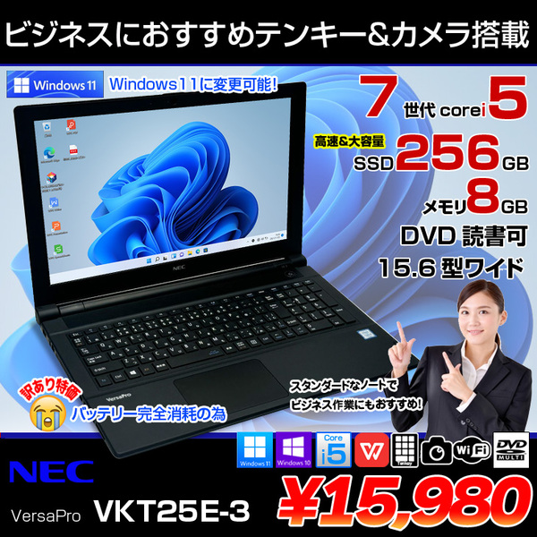 【中古パソコン】NEC VersaPro VKT25E-3 中古ノート 選べる Win11 or Win10 Office 第7世代 テンキー カメラ[Corei5 7200U メモリ8G SSD256GB マルチ 無線 15.6型 ] :訳あり