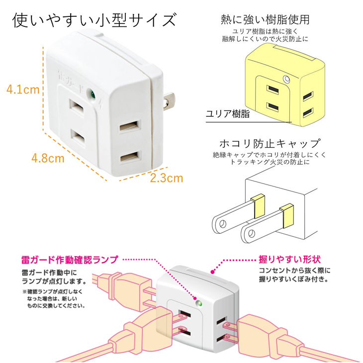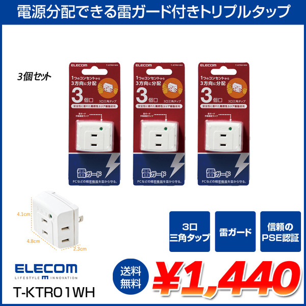 ELECOM トリプルタップ 雷ガード付 T-KTR01WH ホワイト 3個口 3個セット 送料込み