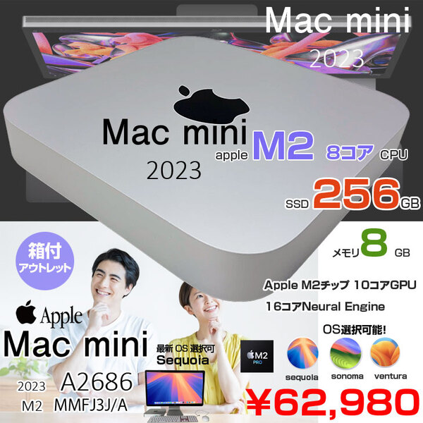 【中古パソコン】Apple Mac mini MMFJ3J/A A2686 M2 2023 小型デスク 選べるOS [Apple M2 8コア メモリ8GB SSD256GB 無線 BT シルバー 純箱 ]:アウトレット
