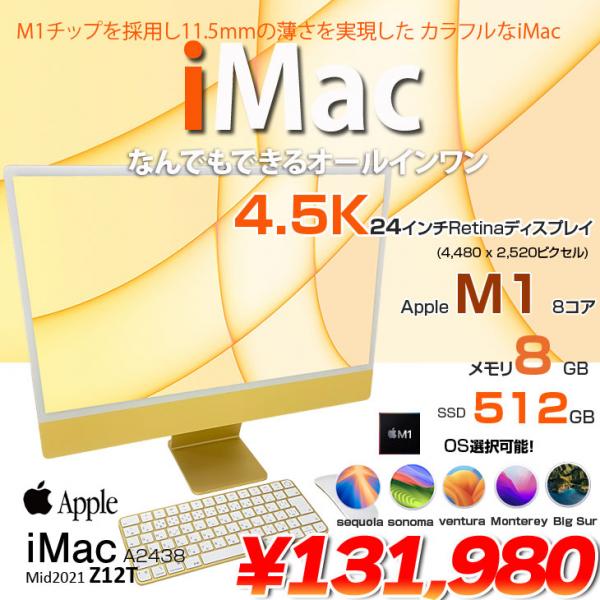 【中古パソコン】Apple iMac 24inch Z12T A2438 4.5K 2021 一体型 選べるOS Touch ID [Apple M1 8コア 8GB SSD512GB 無線 BT カメラ 24インチ Yellow 箱]:美品