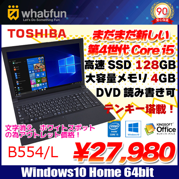 【中古パソコン】東芝 B554/L 中古 ノートパソコン Office Win10 第4世代 高速SSD塔載 テンキー カメラ [core i5 4300M 2.6GHz 4G SSD128GB マルチ 15.6型 ] :アウトレット