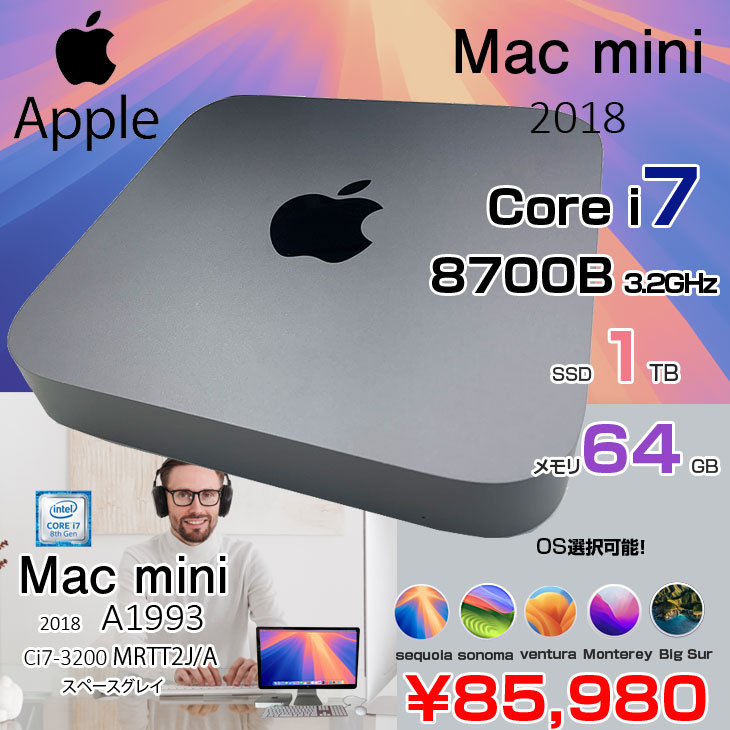 【中古パソコン】Apple Mac mini MRTT2J/A A1993 2018 小型デスク 選べるOS [Core i7 8700B 3.2GHz メモリ64GB SSD1TB 無線 BT スペースグレイ ]:良品