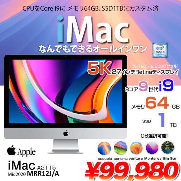 【中古パソコン】Apple iMac 27inch MRR12J/A A2115 5K 2019 一体型 選べるOS [Core i9 9900K 3.6GHz メモリ64GB SSD1TB 無線 BT カメラ 27インチ 純箱]:アウトレット