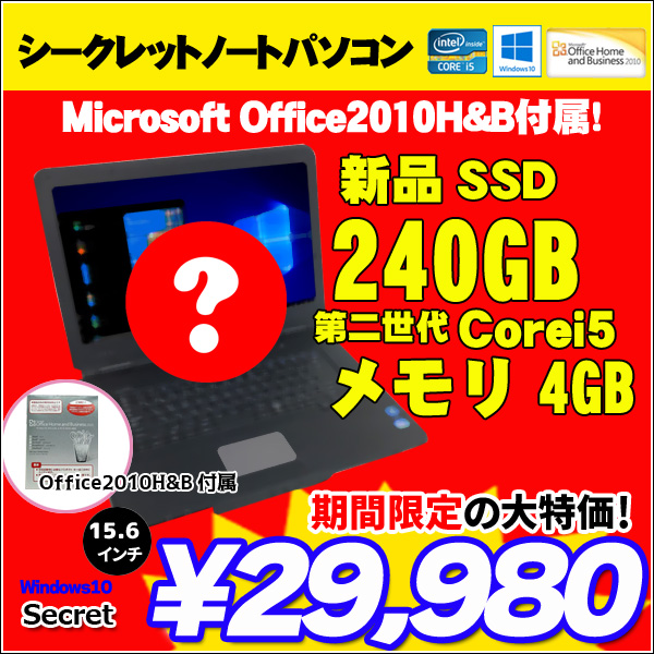 【中古パソコン】中古 シークレットノート メーカー&型番不問 パワポも使えるMicrosoft Office2010H&B付 二世代 Office Win10[corei5 2520M 2.5GHz 4GB SSD240GB マルチ 15.6型] :良品