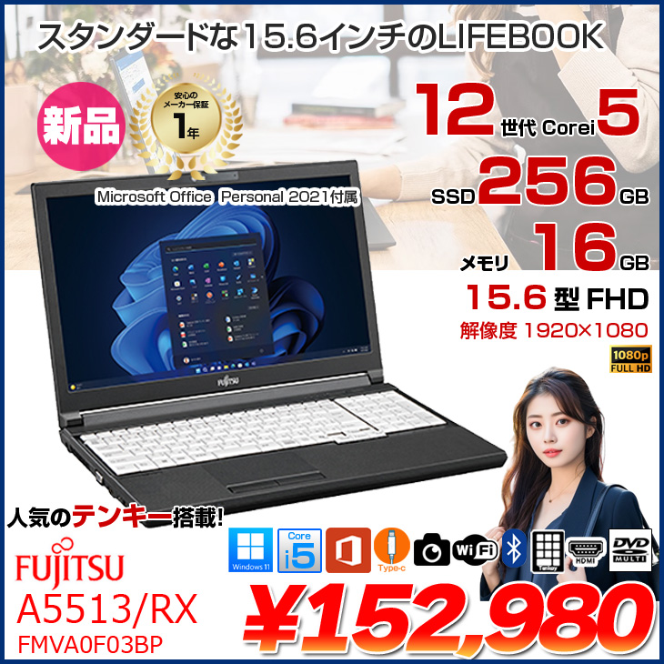 【新品パソコン】富士通 LIFEBOOK A5513/RX FMVA0F03BP ノート Win11 Office2021付属 第12世代[Core i5 1235U メモリ16GB SSD256GB カメラ FHD 15.6型]:新品