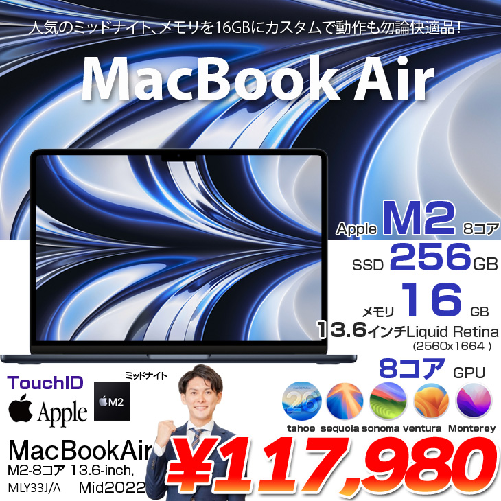 【中古パソコン】Apple MacBook Air 13.6inch MLY33J/A A2681 2022 TouchID 選べるOS [Apple M2 8コア メモリ16GB SSD256GB 無線 BT カメラ 13.6 Midnight] :良品