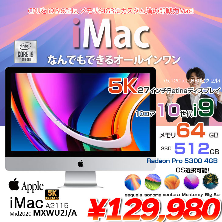 【中古パソコン】Apple iMac 27inch MXWU2J/A A2115 5K 2020 一体型 選べるOS [Core i9 10910 3.6GHz 64GB SSD512GB RP5300(4GB) 無線 BT カメラ 27インチ ]:良品