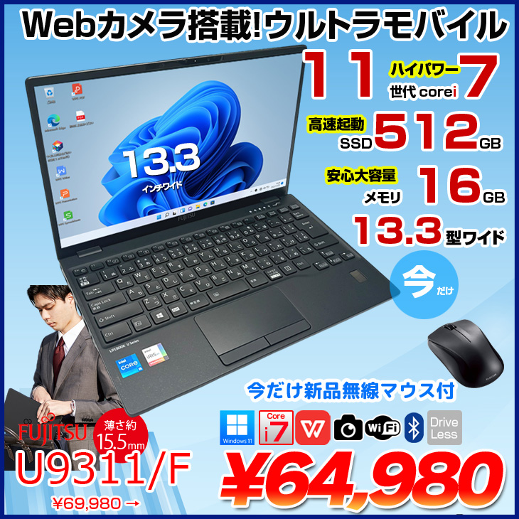【中古パソコン】【今だけ無線マウスプレゼント】富士通 LIFEBOOK U9311/F 中古 ノート Office Win11 第11世代[Core i7 1185G7 メモリ16GB SSD512GB カメラ 13.3]:良品