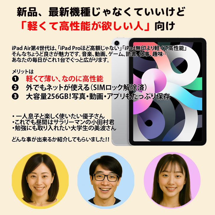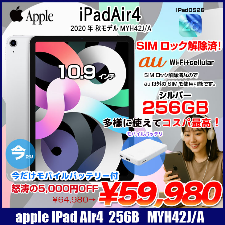 【SIMロック解除済】【今だけ!期間限定価格+モバイルバッテリー付】Apple iPadAir4 第4世代 MYH42J/A au Wi-Fi+cel 256GB A2072 [A14 Liquid Retina 10.9 最新OS iPadOS26 シルバー] :アウトレット