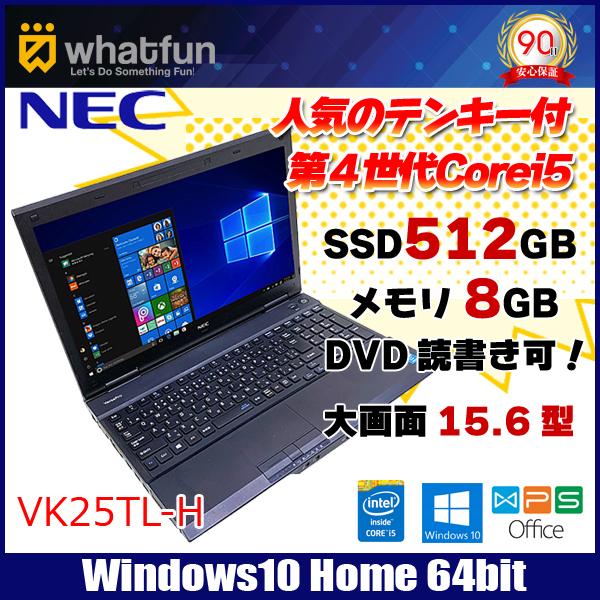 【中古パソコン】NEC VK25T/L-H 中古 ノートパソコン Office Win10 第4世代 テンキー [core i5 4200M 2.5GHz 8GB SSD512GB マルチ 無線 15.6型 ] :良品
