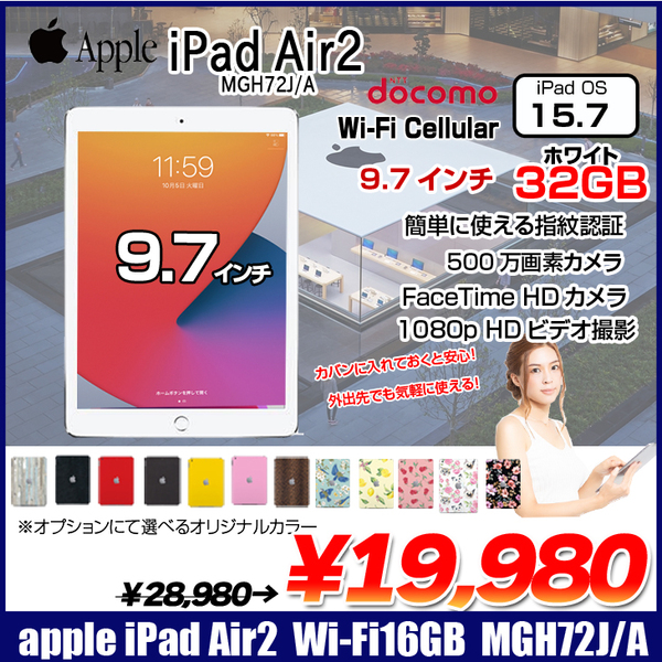 【中古iPad】Apple iPad Air2 MGH72J/A Retina Docomo Wi-Fi+Cel 指紋認証 選べるカラー [ A8X 16GB(SSD) 9.7 iPadOS 15.4シルバー ] :アウトレット