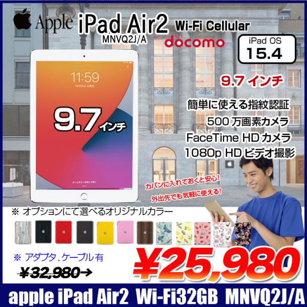 【中古iPad】Apple iPad Air2 MNVQ2J/A Retina Docomo Wi-Fi+Cellular 32GB 指紋認証 選べるカラー [ A8X 32GB(SSD) 9.7インチ iPadOS 15.4シルバー ] :良品 中古