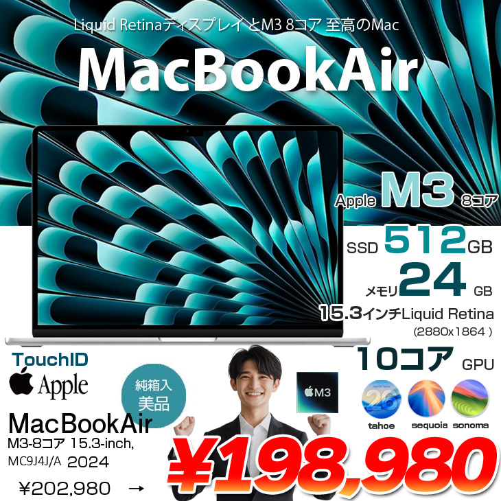 【中古パソコン】Apple MacBook Air 15.3inch MC9J4J/A 3114 2024 選べるOS TouchID [Apple M3 8コア メモリ24GB SSD512GB 無線 BT カメラ 15.3 Silver 純箱] :美品