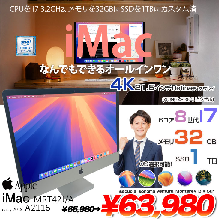【中古パソコン】Apple iMac 21.5inch MRT42J/A A2116 4K 2019 一体型 選べるOS [Core i7 8700 3.2GHz メモリ32GB SSD1TB 無線 BT カメラ 21.5インチ ] :アウトレット