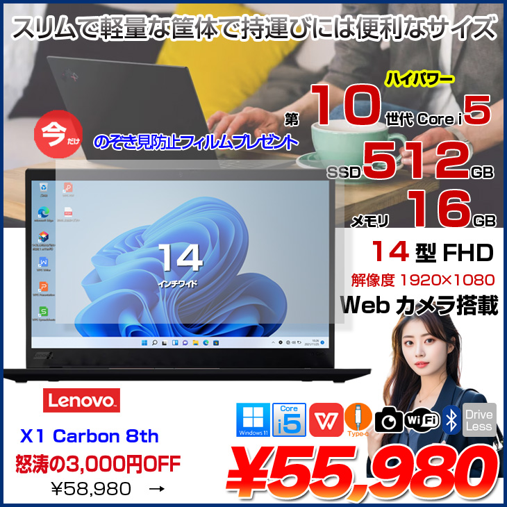 【中古パソコン 今だけ限定価格+覗き見防止フィルム付】Lenovo X1 Carbon gen8 20UA-S4T90 中古 ノート Office Win11 第10世代 [Core i5 10310U メモリ16GB SSD512GB カメラ 14型]:良品