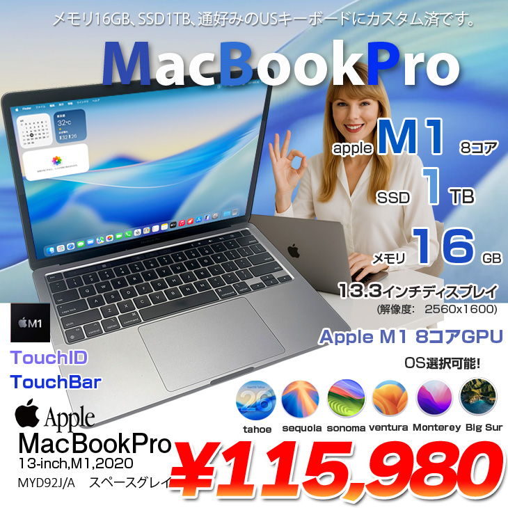 【中古パソコン】Apple MacBook Pro 13.3inch MYD92J/A A2338 2020 USキー 選べるOS TouchBar TouchID [Apple M1 16GB SSD1TB 無線 BT カメラ 13.3 Space Gray] :アウトレット