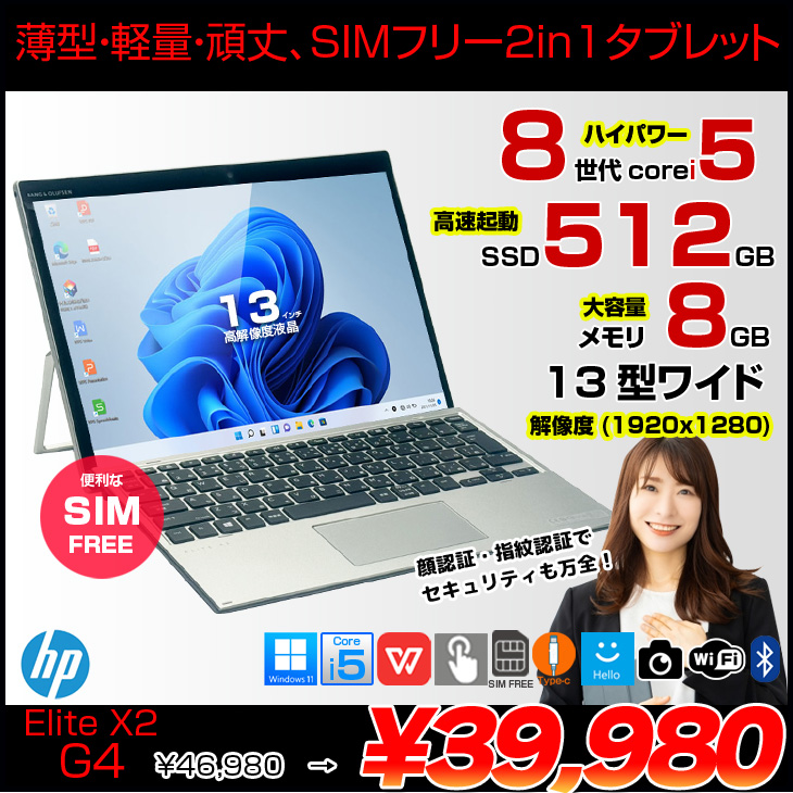 【中古パソコン 中古】HP Elite x2 G4 中古 2in1タブレット Win11 着脱式キーボード SureView LTEスタンダードモデル SIMフリー[Core i5 8265U 8GB SSD512GB 無線 カメラ 指紋 顔認証 13型]:良品