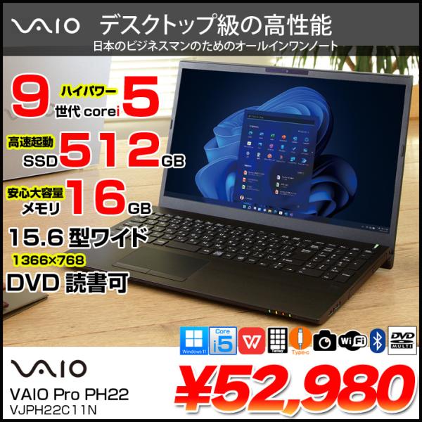 【中古パソコン】SONY VAIO Pro PH VJPH22C11N 中古 ノートOffice Win11第9世代[Core i5 9300H メモリ16GB SSD512GB 無線 カメラ マルチ Bluetooth 15.6型」:良品