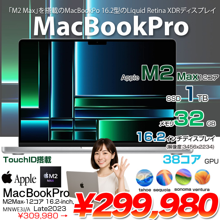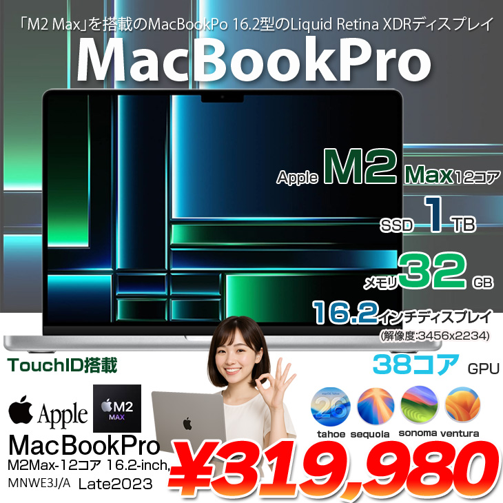 【中古パソコン】Apple MacBook Pro 16inch MNWE3J/A A2780 Early 2023 TouchID 38コアGPU [Apple M2 Max 12コア メモリ32G SSD1TB 無線 BT カメラ Silver ] :良品