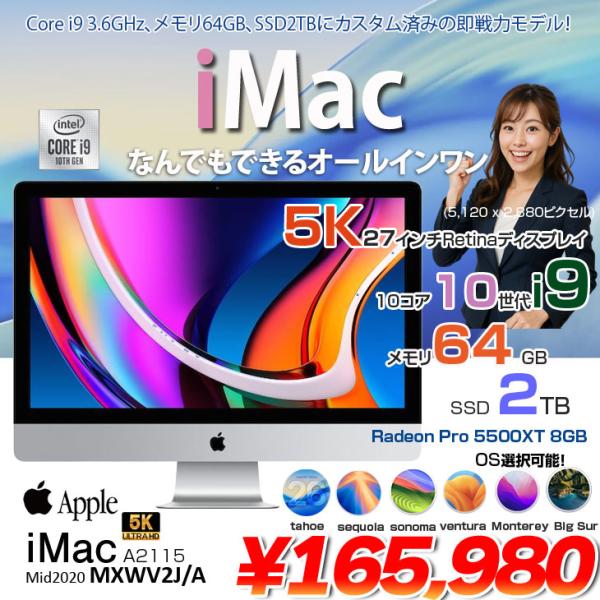 【中古パソコン】Apple iMac 27inch MXWV2J/A A2115 5K 2020 一体型 選べるOS [Core i9 10910 64GB SSD2TB RP5500XT(8GB) 無線 BT カメラ 27インチ ]:良品