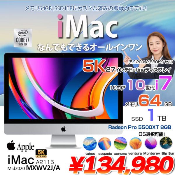 Apple iMac 27inch MXWV2J/A A2115 5K 2020 一体型 選べるOS [Core i7 10700K 64GB SSD1TB RP5500XT(8GB) 無線 BT カメラ 27インチ ]:良品