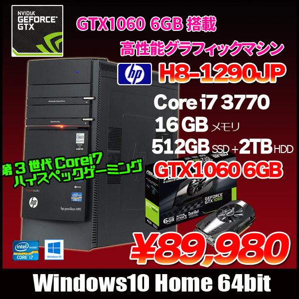 【中古パソコン】HP Pavilion H8-1290JP ハイブリッド ゲーミングパソコン GTX1060 6GB搭載 [core i7 3770 3.4GHz メモリ16G HDD2TB+SSD512GB マルチ ]