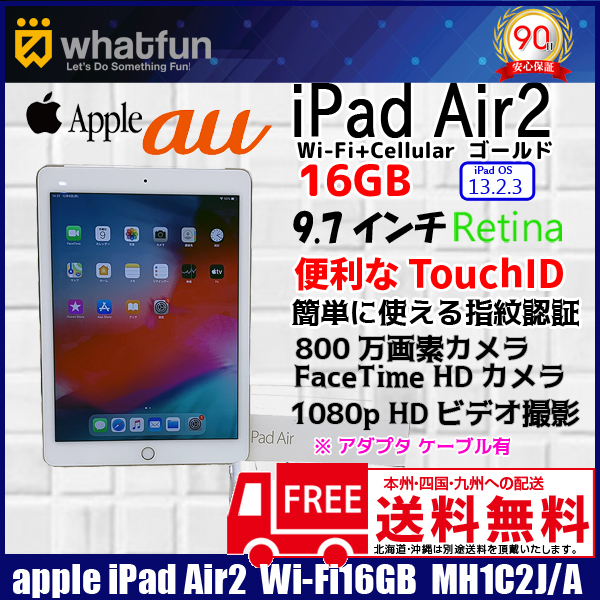 【中古iPad】Apple iPad Air2 MH1C2J/A Retina au Wi-Fi+Cellular 16GB 指紋認証 [ A8X 16GB(SSD) 9.7インチ iPadOS 13.2.3 ゴールド ] :良品 中古