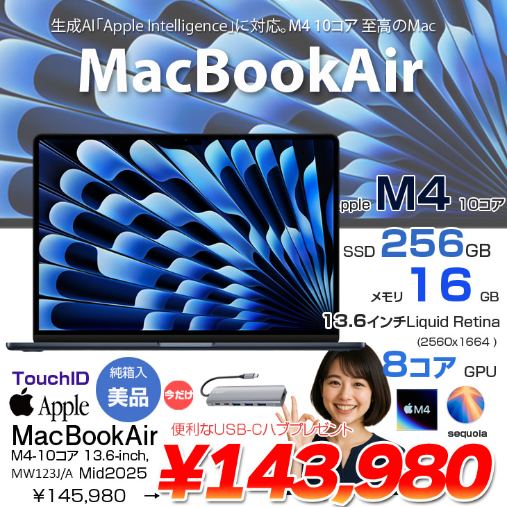 【中古パソコン 今だけTYPE-Cハブ付】Apple MacBook Air 13.6inch MW123J/A A3240 2025 TouchID [Apple M4 10コア メモリ16GB SSD256GB 無線 BT カメラ 13.6型 Midnight 純箱 ] :美品