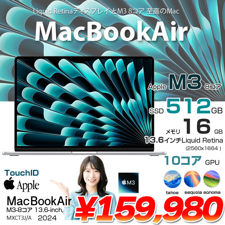 【中古パソコン】Apple MacBook Air 13.6inch MXCT3J/A A3113 2024 TouchID [Apple M3 8コア メモリ16GB SSD512GB 無線 BT カメラ Silver] :良品