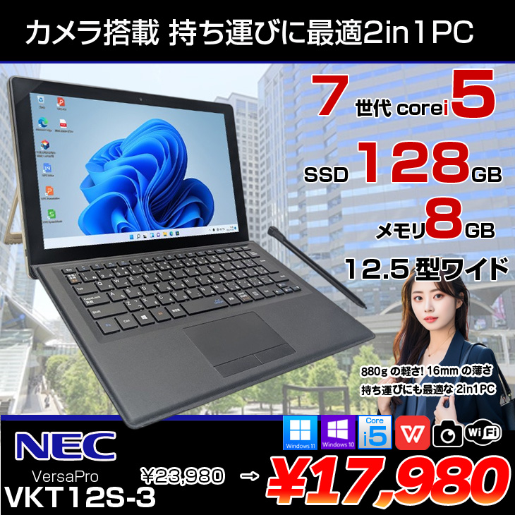 【中古パソコン】NEC VKT12S-3 VS-3 VersaPro 中古 タブレット 2in1 Office Win10 or Win11[Core i5 7Y54 メモリ8GB SSD128GB カメラ スタイラスペン 12.5]:アウトレット