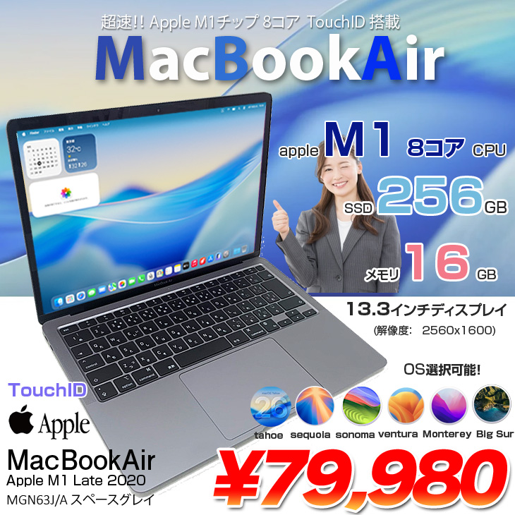 【中古パソコン】Apple MacBook Air 13.3inch MGN63J/A A2337 2020 選べるOS TouchID [Apple M1チップ 8コア 16GB SSD256GB 無線 BT カメラ 13.3 Space Gray] :アウトレット