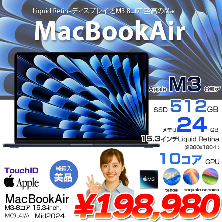 【中古パソコン】Apple MacBook Air 15.3inch MC9L4J/A A3114 2024 選べるOS TouchID [Apple M3 8コア メモリ24GB SSD512GB 無線 BT カメラ 15.3型 Midnight 純箱 ] :美品