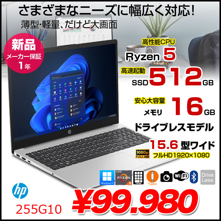 【新品パソコン】HP 255G10 AG8Z8AT#ABJ Windows11 Pro ノートパソコン [AMD Ryzen5 7530U 16GB 512GB 無線 カメラ テンキー フルH 15.6型]:新品