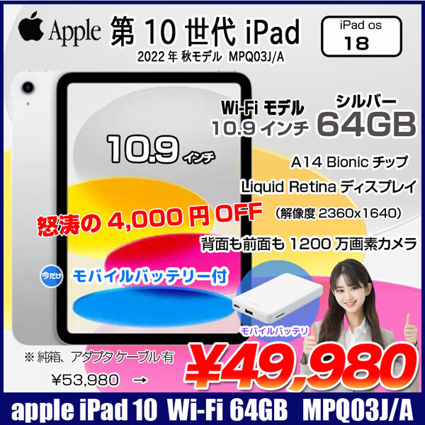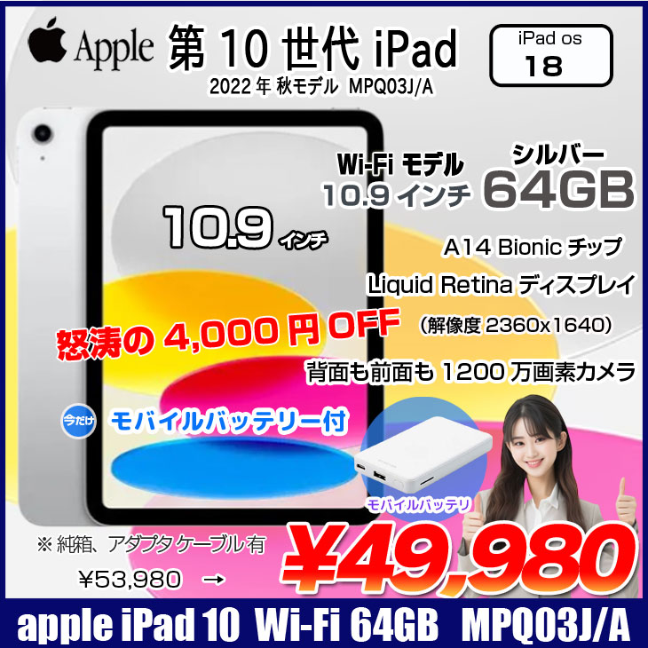 【中古iPad 今だけモバイルバッテリー付】Apple iPad10 第10世代 MPQ03J/A Wi-Fi 2022 64GB A2696 [A14 Bionic 64GB Liquid Retina 10.9 iPadOs 18 シルバー] :良品