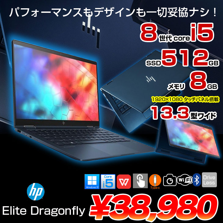 【中古パソコン】HP Elite Dragonfly 2in1ノート office windows11対応[Core i5 8265U メモリ8GB SSD512GB 無線 カメラ 13.3型 ]:良品