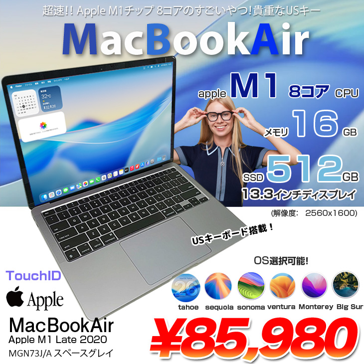 【中古パソコン】Apple MacBook Air 13.3inch MGN73J/A A2337 Late 2020 選べるOS USキー TouchID [Apple M18コア 16GB 512GB 無線 BT カメラ 13.3 Space Gray] :アウトレット