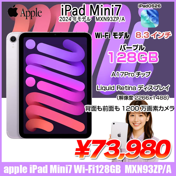【中古iPad】Apple iPad mini7 MXN93ZP/A A2993 第7世代 Wi-Fi 128GB 2024年モデル [ A17 Pro 128GB 8.3型 iPadOS26 パープル ] :良品