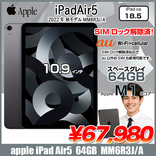【中古iPad SIMロック解除済】Apple iPadAir5 第5世代 MM6R3J/A au Wi-Fi+cel 64GB A2589 [Apple M1 8コア 10.8インチ iPadOS18.6 スペースグレイ] :良品