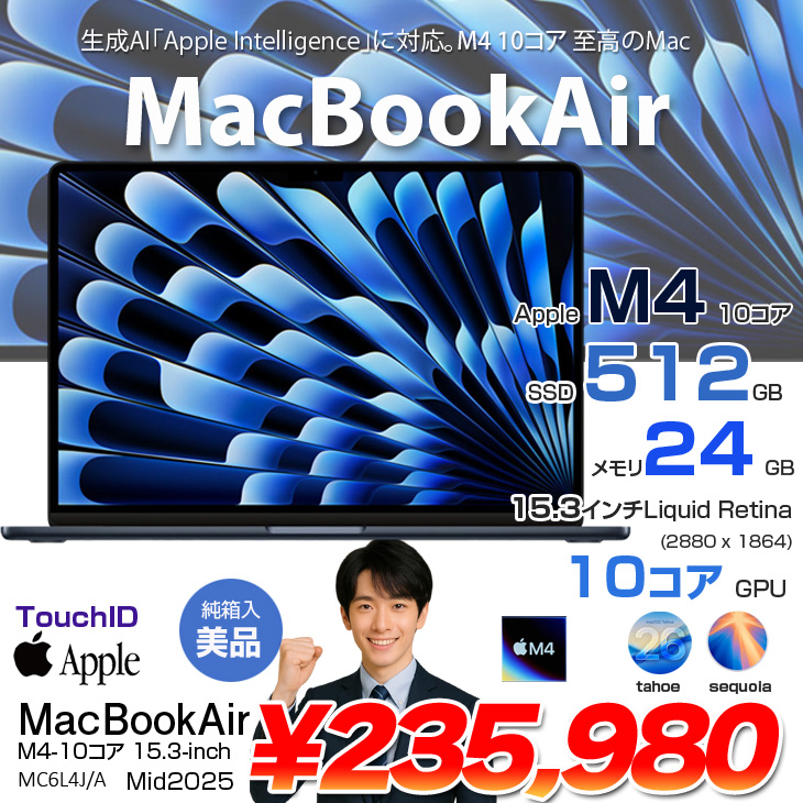 【中古パソコン】Apple MacBook Air 15.3inch MC6L4J/A A3241 2025 TouchID [Apple M4 10コア メモリ24GB SSD512GB 無線 BT カメラ 15.3型 Midnight 純箱 ] :美品