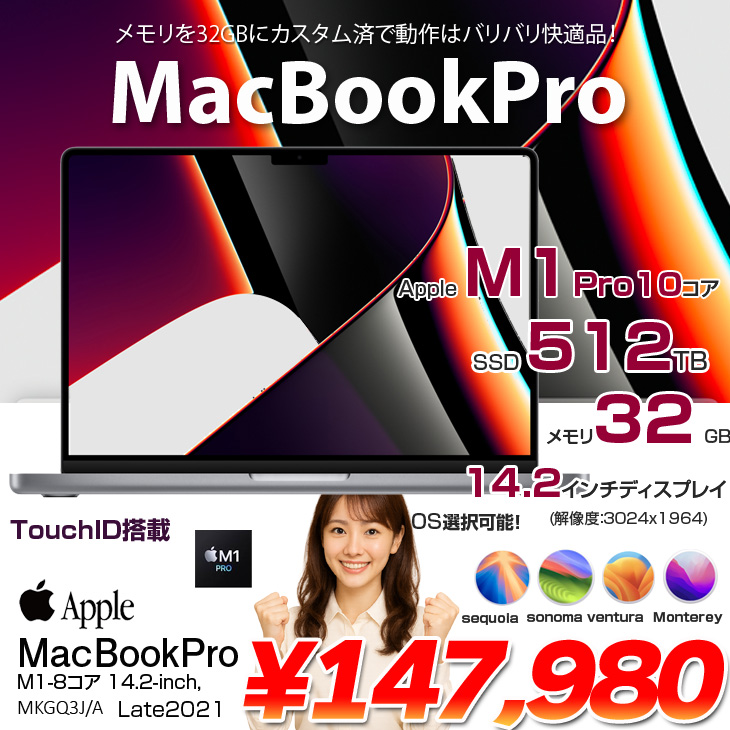 【中古パソコン】Apple MacBook Pro 14.2inch MKGP3J/A A2442 Late 2021 TouchID 選べるOS [Apple M1 Pro 8コア 32G 512GB 無線 BT カメラ 14.2 Space Gray 純箱]:アウトレット