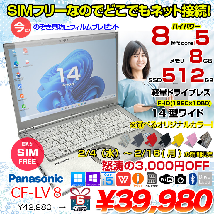 【2/4-16まで期間限定価格】【今だけ覗き見フィルムプレゼント中】Panasonic CF-LV8 [Core i5 8265U メモリ8GB SSD512G 無線 カメラ フルHD 14型] : 良品 ●Let's Note CF-LV8 CF-LV8KF9VS 中古ノートパソコン ★SIMフリー Office付き Windows11