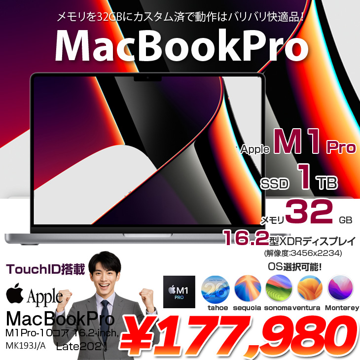 【中古パソコン】Apple MacBook Pro 16inch MK193J/A A2485 Late 2021 TouchID 選べるOS [Apple M1 Pro 10コア 32GB SSD1TB 無線 BT カメラ 16.2 Space Gray ]:アウトレット